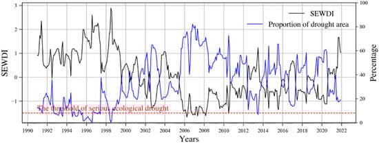 Time series of monthly SEWDI and proportion of drought area in North China from Janurary 1991 to Decmember 2021.