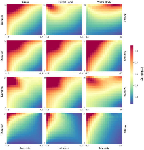 Figure 18 shows that vulnerability is higher in spring, summer, and autumn and lower in winter for both terrestrial and aquatic systems in North China. The phenomenon that forest vulnerability is lower than grassland is more pronounced. For example, for forests, when autumn drought intensity is −0.75 and drought area proportion is 45%, the vulnerability index is 0.79, while for grasslands under the same conditions, the vulnerability index is 0.91.