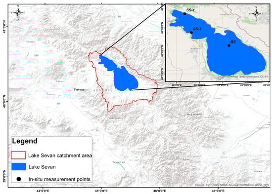 Lake water quality is a key factor for human well-being and environmental health but is at risk due to anthropogenic activities leading to nutrient pollution and eutrophication [,]. Major drivers are urban and domestic wastewater inputs, agricultural land use and run-off as well as climate change. For protecting lake ecosystems and fulfilling human needs at the same time, proper management is needed, and adequate monitoring and understanding of the lake ecosystem are key prerequisites for successful management. Generally, field measurements (further on called in situ monitoring) are widely accepted as proper instruments for water quality monitoring. However, in many regions, classical monitoring capacities are limited, and in the case of large water bodies, they lack monitoring at the required spatial and temporal scales [,,,]․ In this context, remote sensing is a good complement because of the main advantage to cover vast geographical areas, which shows the great potential to be used for assessing spatiotemporal dynamics of water quality in a cost-effective and informative manner. However, remote sensing data are not a one-size-fits-all solution and require in situ data-based validation to ensure the reliability of the provided information [,,,,,].