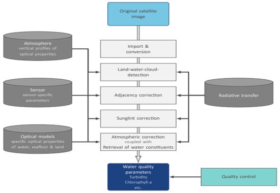 These scenes were processed for the target parameters CHL, Secchi Disk Depth (SDD) and a qualitative harmful algal bloom (HAB) indicator using EOMAP’s Modular Inversion and Processing System (MIP) [,]. The MIP’s physics-based architecture includes all relevant processing steps to guarantee a robust, standardized and operational retrieval of water properties from satellite data sources. The workflow, as pictured in Figure 2, contains all the necessary steps towards a reliable retrieval of in-water constituents, such as a land–water–cloud differentiation, adjacency correction and a coupled retrieval of atmospheric and in-water properties []. The MIP modules were not accessed directly, but through the browser-based interface of EOMAP’s eoApp® Aqua.