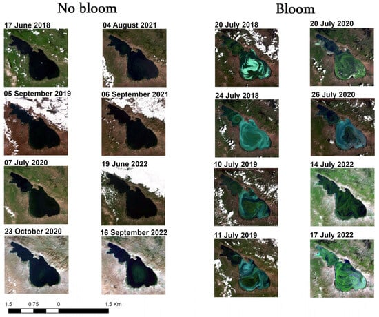 Gevorgyan et al. (2020) had already documented that algal blooms of very high intensity are well visible on the RGB images from satellites for Lake Sevan []. In addition to the physics-based processing of remote sensing data, we therefore defined a simple and pragmatic approach in order to identify blooming events based on the RGB orthophotos. All RGB scenes from 2017 to 2022 were inspected by two water quality experts (M. Schultze and K. Rinke) via the website https://dataspace.copernicus.eu/ (accessed on 21 July 2024); they assigned YES or NO as simple binary variables to each scene with respect to algal blooms. Scenes which appeared to have been too influenced by clouds, sun glint or whitening because of calcite precipitation were excluded by the experts, resulting in 700 scenes evaluated by YES or NO. The experts were unaware of the remote sensing-based results prior to their judgment. All scenes with a visible scum formation and a greenish color were marked as “blooming”.
