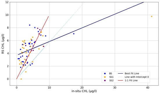 The following supporting information can be downloaded at: https://www.mdpi.com/article/10.3390/rs16193734/s1, Figure S1. Relationship between in situ measured and remotely retrieved CHL (calculated with and without outliers).