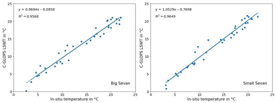 The results of satellite-derived LSWT agreed well with in situ point measurements and reproduced the seasonal cycle of surface temperature. Linear regressions showed high coefficients of determination for satellite vs. in situ-based LSWT for Big Sevan (R2 = 0.96, p < 0.001) as well as for Small Sevan (R2 = 0.96, p < 0.001) (see Figure 5). This agreement signifies the alignment of values between in situ and satellite-derived data.