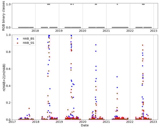 Overview of all 700 scenes with respect to bloom detection by RGB inspection (upper) and HAB-based classification for Lake Sevan (lower).