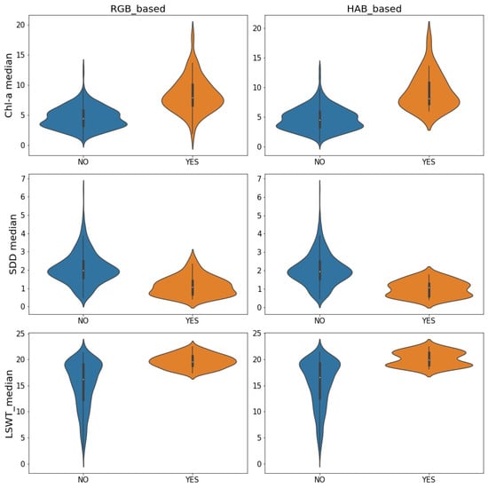 Violin plots of CHL (upper), SDD (middle) and LWST (lower) values contrasting between blooming and non-blooming states. Differentiation of blooming state was either realized by RGB imagery evaluation (left) or by HAB indicator (right).