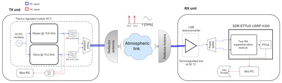 The new RX unit of SWAMM-2 is based on a Ettus USRP X300 board, a scalable Software-Defined Radio (SDR) platform. platform. The first stage of the receiver is a low-noise block (LNB) downconverter, directly connected to the receiving antenna through a WR42 waveguide. The LNB performs a low-noise amplification of about 55 dB and converts the frequencies of the received tones from 18.8 and 19.2 GHz down to intermediate frequencies () of 1.55 and 1.95 GHz, respectively. The IF signal is divided into two separate paths using a resistive power divider, allowing simultaneous processing by the USRP (Ettus X300). The latter is equipped with a Twin RX superheterodyne receiver, which operates the last frequency conversion before being sampled by the FPGA’s ADC at a rate of 210 MS/s with a 14-bit resolution. The digital data stream is decimated to reach the final sampling rate of 250 kS/s, then digitally filtered by a finite impulse response (FIR) low pass filter with a 40 kHz bandwidth. The output data stream is buffered and transmitted to a mini personal computer (PC), which is integrated in the RX unit. The mini PC handles the final processing of the output data stream from the SDR, comprising 12.5 kS for every 50 ms of acquisition.