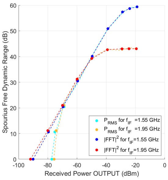 Special attention has been given to characterizing the SDR board’s capability to estimate the received power in the presence of disturbances. In addition to thermal noise, these disturbances include spurs resulting from the SDR board’s imperfect linearity, affecting both the and power estimates. For improved characterization, we utilized the spurious free dynamic range (SFDR) parameter, which is the ratio (in dB) between the fundamental tone and the highest spur in the estimated power spectrum. Using a calibrated signal generator, we generated tones at the two aforementioned IF frequencies (1.55 GHz and 1.95 GHz) with power levels ranging from −80 to −20 dBm in 10 dBm increments, which were then input into the receiver. The SDR noise floor was determined by turning off the input source.