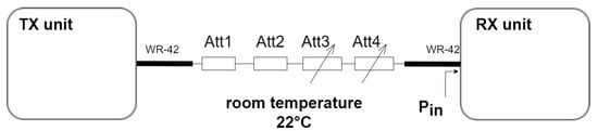 System calibration setup: the previously calibrated TX is connected to the RX through a series of WR42 waveguide attenuators, labeled as Att1, Att2, Att3, and Att4 in the picture. Att1 and Att2 introduce a fixed attenuation of 30 and 43 dB, respectively, while Att3 and Att4 provide variable attenuations, ranging from 0 to 30 dB and from 0 to 50 dB, respectively. All the attenuators were previously characterized using a vector network analyzer (VNA).
