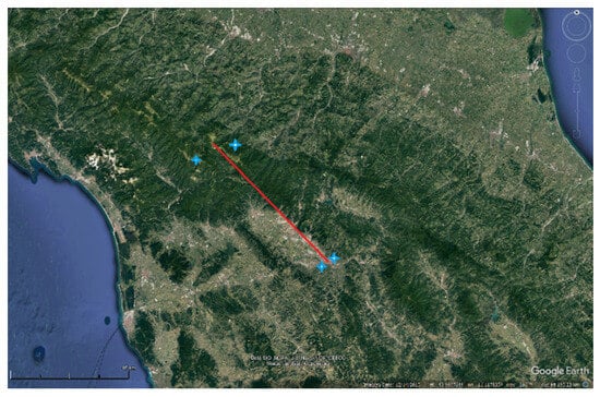 Geographical arrangement of the measurement instruments. The red line represents the radio link between the TX (44.1277°lat., 10.6434°lon., 1880 m a.s.l.) and the RX (43.7985°lat., 11.2528°lon., 60 m a.s.l.). The blue stars indicate the positions of the four ground weather stations considered for the joint data analysis (see Table 2).