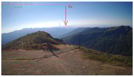 The SWAMM-2 instrument was utilized for a new measurement campaign in Tuscany, Italy, from July to November 2022. The TX was installed at the summit of Monte Gomito (44.1277°lat., 10.6434°lon., 1892 m altitude) and the RX on the roof of the Department of Information Engineering at the University of Florence (43.7985°lat., 11.2528°lon., 50 m altitude). The radio link spanned a distance of 61.15 km. Additionally, a webcam was set up at the TX site pointing towards the RX site, to provide continuous qualitative information on atmospheric conditions (i.e., clear sky/cloud/rainfall/fog) throughout the day. In order to perform a comparative analysis with respect to the measurements provided by the SWAMM-2 instrument, data collected by the network of weather stations of the “Regional Hydrological Service of Tuscany” were used. The network covers the whole regional territory and consists of measurement sites equipped with a complete set of weather sensors (pressure, temperature, wind, humidity, and rainfall). There are more than 600 of these sites over Tuscany, providing measurements every 15 min. Data are available in nearly real time (a few minutes time lag) through a dedicated communication infrastructure. Among these weather stations, the two closest to the RX site and the two closest to the TX site were selected. Figure 6 shows the geographical position of the radio link and of the four stations considered, whose IDs and coordinates are reported in Table 2, while Figure 7 displays the webcam view directed towards the receiver. The atmospheric parameters used in our analysis are (1) pressure, temperature, and relative humidity provided by the weather stations, so as to compute the absolute humidity at each site; (2) the 15 min cumulative rainfall to monitor precipitation, which may cause strong attenuation at the frequencies used, in some cases even leading to signal extinction.