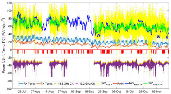 Figure 8, which shows the complete sequence of data collected from 21 July to 21 November 2022, provides an overall view of the parameters measured during the campaign. Specifically, the plots labeled “18.8 GHz Ch” and “19.2 GHz Ch” show the 10 s average power of the signals received on the two NDSA channels. As discussed in Section 2 and shown in Figure 2, the spurious level of the power is reached at around −90 dBFS. A margin of 20 dBFS was introduced; therefore, data below −70 dBFS were discarded. The longer periods of time with no SWAMM-2 signal in Figure 8 correspond to the intervals when the instrument was switched off due to supply interruption.