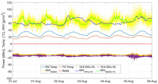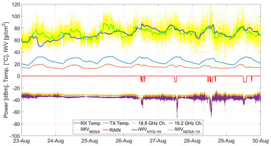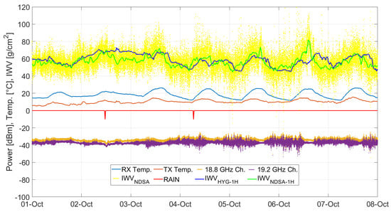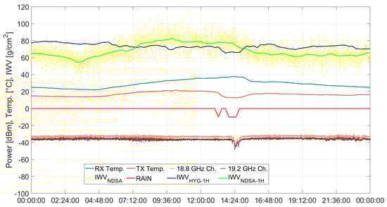 Campaign data in a single snapshot. RX temp: mean value of the temperatures measured by the stations RX1 and RX2. TX temp: mean value of the temperatures measured by the stations TX1 and TX2. RAIN: 0 no rainfall; −10 rainfall in at least one of the four weather stations. 18.8 GHz Ch and 19.2 GHz Ch: received powers at the two NDSA channels. and : the IWV computed by the SWAMM-2 instrument with 10 s and 1 h integration interval, respectively. : the IWV computed through Equation (4). UTC time.
