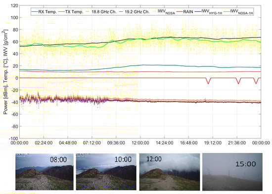 The signal drops on both receive channels are caused by precipitation along the TX–RX radio link. This evidenced in better detail by Figure 9, reporting the 24 h data of 7 August 2022 and the webcam image taken at 11.20 a.m., clearly showing the presence of rainfall. In fact, a typical short summer storm occurred between 11.00 and 14.30 in the measurement area. Analogously, Figure 10 shows the 24 h data of 28 July 2022, when a thunderstorm occurred between 13.00 and 15.00 in the measurement area. In this second case, the total attenuation was quite smaller, indicating a lower level of average rainfall rate along the link. It is important to note that in both cases there is no impact on the estimates, as the two received powers undergo the same attenuation thanks to the proximity of the two frequencies used. Therefore, as long as the two received signals keep above −70 dBFS, it would be possible to estimate the path-averaged rainfall rate along with IWV, exploiting the tight link between attenuation and rainfall intensity (see, for instance, [,,] for a recent survey of methods).