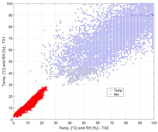 Temperature (red markers) and relative humidity (blue markers) recorded by the weather station TX1 versus that recorded by station TX2. The correlation coefficients for temperature and relative humidity measurements are 0.94 and 0.52, respectively.
