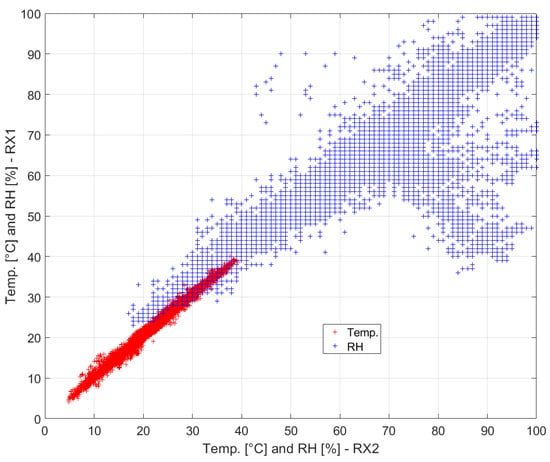 Temperature (red markers) and relative humidity (blue markers) recorded by the weather station RX1 versus that recorded by station RX2. The correlation coefficients for temperature and relative humidity measurements are 0.99 and 0.72, respectively.