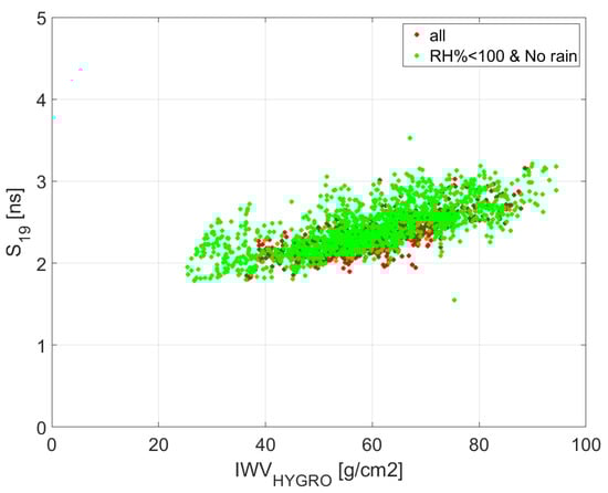 The picture that illustrates the overall statistical relation between the measurements by the SWAMM-2 instrument and the IWV estimates derived using the meteorological stations is shown in the scatter plots of Figure 17, which show the spectral sensitivity measurements averaged over 1 h vs. . Specifically, the red markers refer to the whole campaign data, while the green ones refer only to data acquired in clear air conditions. Such conditions are the (a) absence of rainfall over all the four weather stations, and (b) relative humidity lower than 100% over all the four weather stations. The correlation coefficients of the red and green scatter plot are 0.68 and 0.71, respectively, which demonstrates a decent statistical link between what was observed by the SWAMM-2 instrument and by the four weather stations.