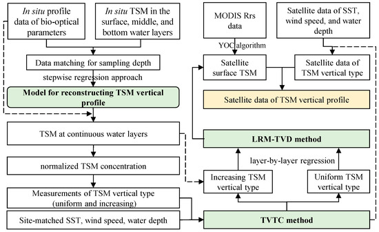 Based on satellite products of SST, wind speed, and water depth, the TSM vertical types were derived using the proposed TVTC method. Satellite-derived TSMsurf data were then obtained from MODIS Rrs data using the YOC algorithm. By integrating satellite-derived TSM vertical types, the vertical distribution of TSM was estimated using LRM-TVD method.