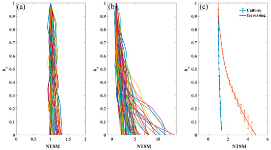 The TSM vertical distribution in the BSYS: samples of the uniform type (a); samples of the increasing type (b). Schematic diagram of TMS vertical distribution types (c).