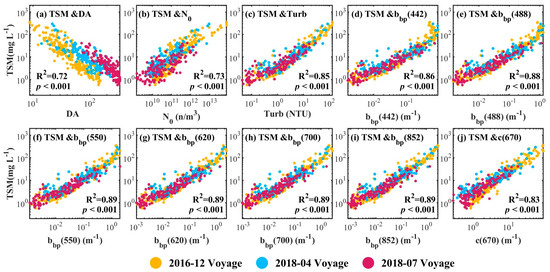 Correlation between the TSM concentrations and different bio-optical paraments.