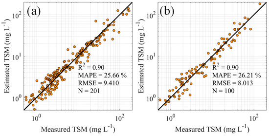 Comparisons between the measured and estimated TSM concentrations in training (a) and testing dataset (b). Solid lines represent the 1:1 line.