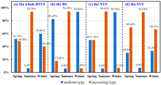 For the 223 samples in the BSYS, the vertical distribution of TSM concentrations was obtained using the TSM reconstruction model with the coefficients provided in Table 1. The NSTM (hr) profile data were then calculated following Equation (5), and their TSM vertical types were classified based on the rate of increase in the NTSM profile. Statistical analysis showed that 42.6% (N = 95) of all stations exhibited the uniform type of TSM vertical distribution, while 57.4% (N = 128) of all stations showed the increasing type. Additionally, we analyzed the seasonal variations of TSM vertical types (Figure 6). In the BSYS, both the uniform and increasing types of TSM vertical distribution were observed in spring, summer, and winter, with their proportions varying by season. In spring, the proportions of uniform (51.7%) and increasing types (48.3%) were nearly equal. In summer, the increasing type was overwhelmingly dominant, constituting approximately 93.7%. In winter, the uniform type (59.8%) was predominant, slightly higher than the increasing type (40.2%). Furthermore, the TSM vertical distribution types exhibited regional differences, as shown in Figure 6. In relatively shallow areas such as the BS and North Yellow Sea (NYS), the uniform type predominated in spring and winter. In the South Yellow Sea (SYS), the increasing type was more prevalent in spring and winter, particularly in relatively deeper areas.