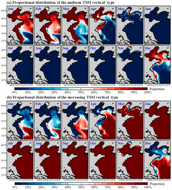 Based on monthly satellite data of SST, wind speed, and water depth, monthly satellite products of TSM vertical types in the BSYS were generated using the proposed TVTC method. Subsequently, the proportions of uniform and increasing TSM vertical types were calculated from January to December to effectively present their variability, as shown in Figure 10. During the winter months (December, January, and February), the Bohai Sea region predominantly exhibited a uniform TSM vertical type. However, in January, a low proportion of the increasing TSM vertical type was observed in the Bohai Strait and the central Bohai Sea. This observation aligns with the lower proportion (6.4%) of the increasing TSM type in winter (see Figure 6). In early and mid-spring (March and April), the TSM concentrations in the BS primarily displayed a uniform type. By late spring (May), with rising temperatures, the TSM vertical distribution type shifted to the increasing type, which persisted through summer (June, July, and August) and autumn (September, October, and November). In the northern area of the Yellow Sea (NYS), the spatial pattern of TSM vertical types during winter and early spring resembled that of the Bohai Sea, with the uniform type being predominant. This was consistent with field-measured results in Figure 6, which showed that the uniform type accounted for approximately 92.9% in the northern area of the Yellow Sea during winter. Starting in April, the TSM vertical distribution type gradually transitioned to the increasing type, which persisted until November. In contrast, the southern area of the Yellow Sea, located at a lower latitude and connected to the open sea, has deeper waters and maintains higher SST throughout the year. The southern area of the Yellow Sea exhibited the highest proportion of the increasing type throughout most months of the year. Nevertheless, during winter (December, January, and February) and early spring (March), the uniform type of TSM vertical distribution was predominant in the nearshore waters.