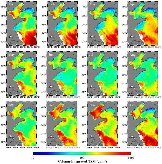 Monthly distributions of the column-integrated TSM in the BSYS during the period from 2003 to 2021.