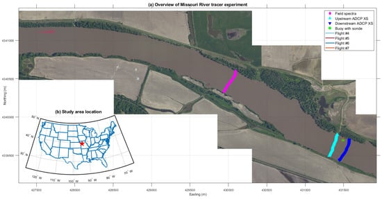 - Legleiter, C.; Scholl, V.; Sansom, B.; Burgess, M. Hyperspectral Image Transects and Field Measurements of Reflectance, Visible Dye Concentration, and Flow Velocity Acquired during a Tracer Experiment on the Missouri River Near Lexington, MO, on May 11, 2024; U.S. Geological Survey data release; U.S. Geological Survey: Reston, VA, USA, 2024.