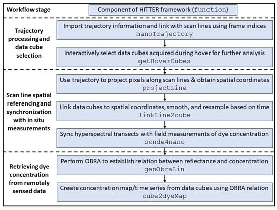 - The workflow includes modules for initial trajectory processing, hyperspectral data cube selection, scan line spatial referencing, temporal and spectral smoothing and spatial interpolation of the aggregated spectral data onto a mean cross-section, synchronization with in situ measurements, calibration of a relationship between reflectance and the water attribute of interest, and generation of output time series and transects. These steps are implemented with a series of custom MATLAB functions made available through a data release associated with this study [27].