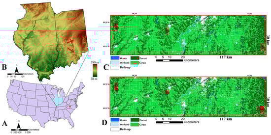 Our study is located across the boundary of Illinois and Indiana, in the Midwest U.S. (Figure 2). The whole area covers 3510 km2 (117 km × 30 km), ranging from 36.97°N to 42.51°N in latitude and from 84.78°W to 91.51°W in longitude, located in the humid continental climate zone.