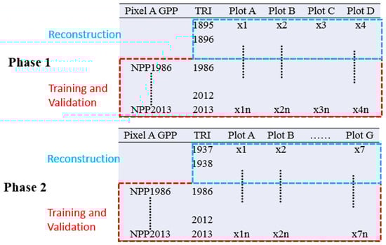 The whole study time was divided into three phases: Phase 1 (1895–1937), Phase 2 (1938–1985), and Phase 3 (1986–2013). The training set included GPP values from 1986 and tree-ring indices (TRI) of multiple plots from 1986 to 2013. For Phase 1 and Phase 2, we trained the GPP–TRI models individually and chose the best models for these two phases (Figure 1).