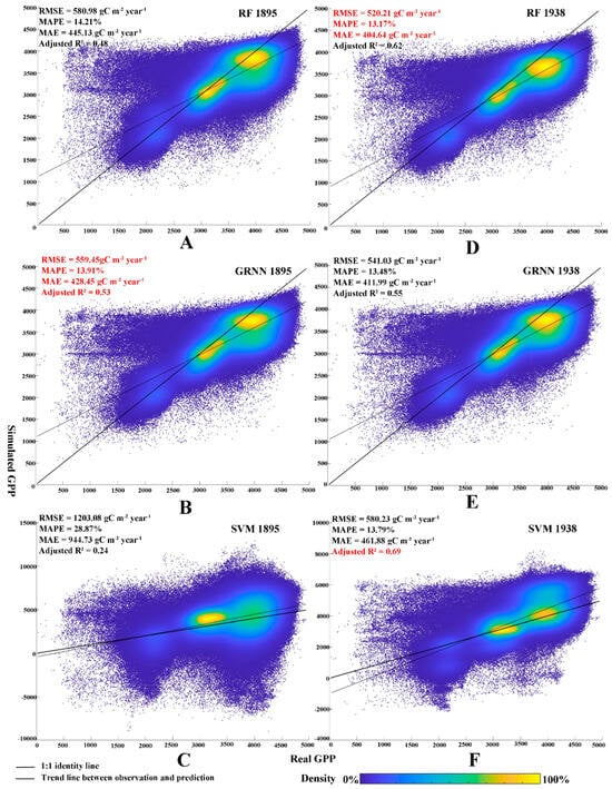 In both phases, we conducted three approaches (RF, GRNN, and SVM) to reconstruct GPP values and applied five validations in each phase. In Phase 1 (1895–1937), tree-ring indices (TRI) in four plots were involved in our regression (Figure 4), and the rest of the three plots did not have available data from 1895 to 1937. GRNN obviously outperformed the other approaches of RMSE, MAPE, MAE, and Adjusted R2 of GRNN were the following: 559.45 g C m−2 year−1, 13.91%, 428.45 g C m−2 year−1, and 0.53, so we chose GRNN. The SVM was the worst whose RMSE (1203.08 g C m−2 year−1) was more than twice as much as GRNN’s. In Phase 2 (1938–1985), all seven plots were used in our research. The RF had the lowest RMSE (520.21 g C m−2 year−1), the lowest MAPE (13.17%), and the lowest MAE (404.64 g C m−2 year−1), even though SVM had the highest adjusted R square (0.69). The R square could not fit non-linear curves very well, and the rest of the metrics for SVM were the worst among the three. Then, we chose RF as our best model in Phase 2 and GRNN ranked second. For the same approach, the performance in Phase 2 using seven plots was always better than that in Phase 1 using four plots where RF’s RMSE in Phase 1 and Phase 2 were 580.98 g C m−2 year−1 and 520.21 g C m−2 year−1, while GRNN RMSEs in Phase 1 and Phase 2 were 559.45 g C m−2 year−1 and 541.03 g C m−2 year−1, respectively. Even though the GRNN was the best model in Phase 1, its metrics were still worse than the RF’s (the best model in Phase 2). More details about the 5-fold validations can be found in the Appendix A.