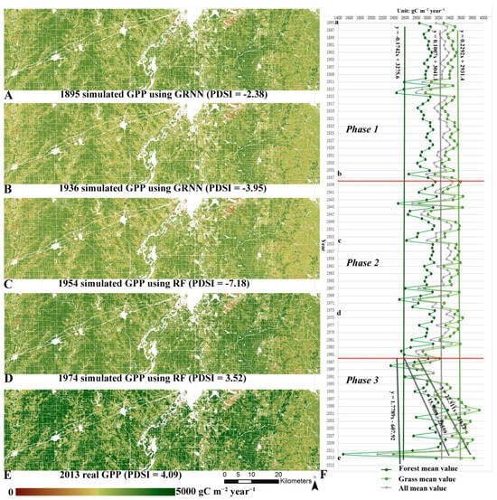 The simulated GPP maps and the GPP tendency curves. Note: The PDSI in the parenthesis was the average PDSI of the growing season. In (E), “All mean value” indicates the average GPP values of all forests and grasslands in our study areas. The lower-case letters in (F) corresponded to the GPP values in specific years whose GPP spatial distribution could be found in (A–E). The dash lines in (F) were the tendencies using real data, while the solid lines were the tendencies using combined data. The red lines separate the three phases of analysis.