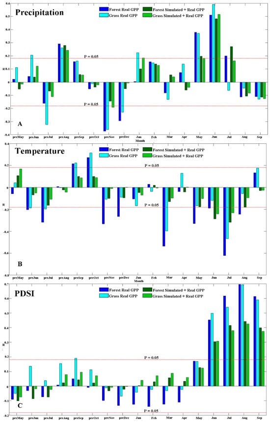 The combined effects of temperature and precipitation could affect GPP absorption (Figure 6C). PDSI in June, July, August, and September had positive relationships with GPP in the whole study area including forest and grassland using combined data and real data. PDSI in the previous September had a positive correlation with GPP in grassland using real data (R grass real PresSep = 0.191), but in the same month, a high correlation could not be found in GPP in forest and grassland using combined data (R forest combined PresSep = 0.043; R grass combined PresSep = 0.096).
