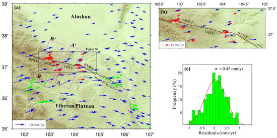 To accurately analyze differential crustal motion between tectonic blocks, we utilized a GNSS velocity field referenced to the stable Eurasian plate [41]. In addition, to precisely model the tectonic characteristics of the Laohushan Fault and enhance our understanding of regional crustal horizontal deformation, we incorporated published high-density GNSS results [42,43], as indicated by the green arrows in Figure 4a. The Helmert parameter transformation method was employed to integrate these published results with the GNSS velocity field derived in this study, ensuring that the residual error at common points in the merged dataset was less than 1 mm/yr (Figure 4c).