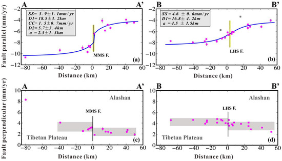 For a comparative analysis of the transverse differences in interseismic fault motion within the region, an additional GNSS velocity profile, B–B’, was constructed across the Maomaoshan Fault, located approximately 100 km west of the Laohushan Fault, using dense GNSS data along the Maomaoshan Fault (Figure 4b). The GNSS horizontal velocity components within the scope of these profiles were projected along directions parallel and perpendicular to the strikes of the Laohushan Fault (NE102°) and the Maomaoshan Fault (NE103°), respectively, to generate the GNSS velocity profiles for these two faults (Figure 5). A two-dimensional dislocation model incorporating fault creep motion was subsequently employed to invert and determine the geometric parameters (creep depth/locking depth) and kinematic parameters (creep rate/deep loading rate) associated with fault creep and locking.