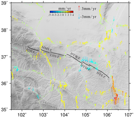In calculating the fault creep rate using InSAR observations, the effects of regional vertical deformation and deformation perpendicular to the fault cannot be neglected [23,25,26]. To account for these effects, we collected precise leveling data for the region from 1970 to 2012. By applying the dynamic least-squares adjustment method [49], we mitigated systematic errors by incorporating the vertical motion rates from continuous GNSS stations as a priori information. This approach enabled us to derive the vertical crustal deformation field for the study area (Figure 6). As depicted in Figure 6, the Haiyuan region exhibits complex vertical deformation, with vertical displacement rates of 1–2 mm/yr observed near the eastern segment of the Laohushan Fault.