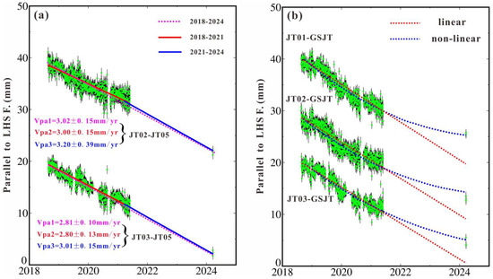 Considering the lack of observations between June 2021 and March 2024 (Figure 2), and to avoid crustal deformation caused by seasonal changes, we selected observation data from the same season in different years. The slip rates for the two cross-fault GNSS baselines (JT03-JT05 and JT02-JT05) within the near-field of the Laohushan Fault (approximately 5 km) were calculated in segments (Figure 7a). The results show that the creep rate in the near-field of the fault does not exhibit significant changes over different time periods, indicating that the creep motion in the fault’s near-field is steady.