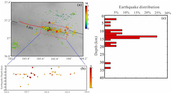 The distribution of small earthquake activity on the Laohushan Fault: (a) The spatial distribution of small earthquake activity on the Laohushan Fault. (b) Red circles represent the projections of small earthquake activity along the depth of the Laohushan Fault, totaling 36 events. (c) The statistical distribution of earthquakes of magnitude 3 or greater with respect to the fault depth.