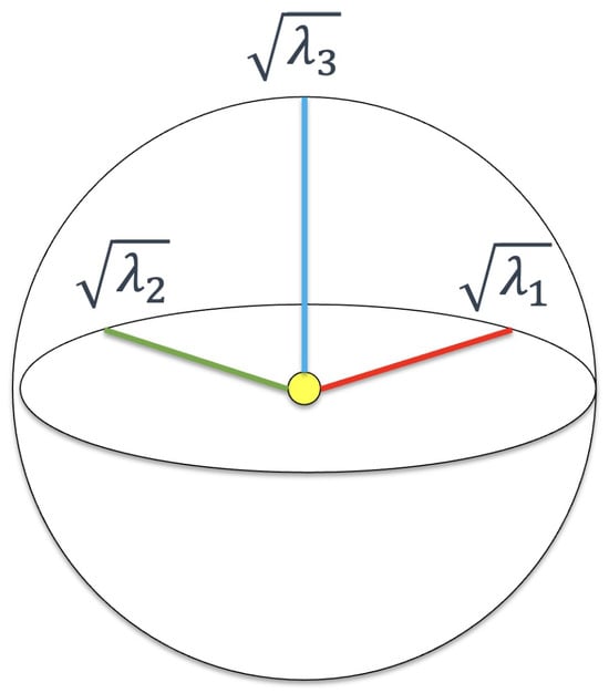 The square roots of the three eigenvalues, , , and , represent the spread of the point distribution in three mutually orthogonal directions as shown in Figure 2. represents the largest spread, while represents the smallest spread. This means and in the case of a flat plane, while is much larger than and in the case of a linear edge. Based on these properties of the eigenvalues, we can construct various definitions of the feature value f by appropriately combining the eigenvalues , , and [,,,,,,,,,]. In our study, we adopt the following definitions for feature value f, selecting the most suitable one for the target data: