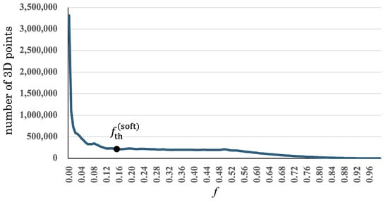 To extract the 3D edges, i.e., the points forming the edge regions, we need an appropriate feature value that determines the edge regions. We adopt the feature value based on the eigenvalues of the 3D structure tensor [], i.e., the local 3D covariance matrix: We consider a local spherical area centered at each point of the target point cloud (see Figure 2). In our study, we set its radius to of the bounding-box diagonal length of the point cloud, ensuring the inclusion of a few hundred points in the area. We calculate the 3D covariance matrix of the point coordinates for each local spherical area. The feature value, f, which is assigned to the centered point, is defined and calculated from the three eigenvalues of the 3D covariance matrix, , , and (). When the feature value f is used, we normalize it so that the values of f are distributed in the range .