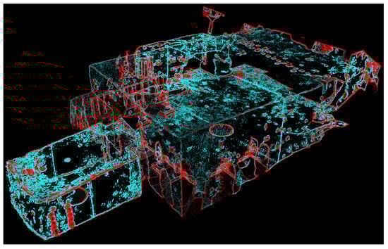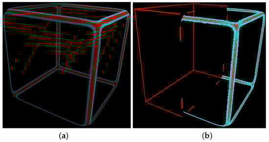 In the dual 3D edge-extraction process explained in Section 4, most of the computation time is consumed traversing all the points stored in an octree, calculating the 3D covariance matrix at each point, and assigning an eigenvalue-based feature value to each point. This situation is common to conventional statistical methods (see Section 2). In Table 1, we compare the computation times for the conventional binary 3D edge extraction and the proposed dual 3D edge extraction, using the point cloud data for Figure 1 and the figures in Section 6. The computational time of each method depends on the point distribution of the target data. However, in any case, our proposed dual 3D edge extraction requires a computational time nearly comparable to that of the conventional binary 3D edge extraction.