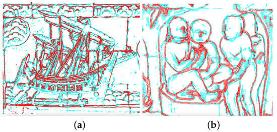 Dual 3D edge extraction for 3D scanned point clouds of wall reliefs in the Borobudur Temple, a UNESCO World’s Cultural Heritage, in Indonesia. The change of curvature is used for f. The determined threshold values are as follows: (a) . (b) .