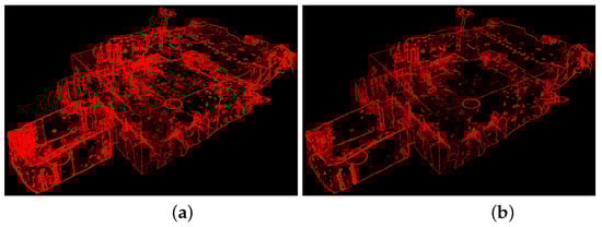 Figure 1 shows edge-highlighting visualization (a) without and (b) with the novel effects realized by our proposed method. The visualized data are the 3D scanned point cloud of the office building at the Tamaki Shinto Shrine (Nara Prefecture, Japan), a nationally important cultural property. The building contains many small rooms, resulting in the appearance of numerous lines through edge extraction. In Figure 1a, the excessive lines dramatically reduce visibility. Conversely, in Figure 1b, the edge lines successfully aid in observing complex internal structures.
