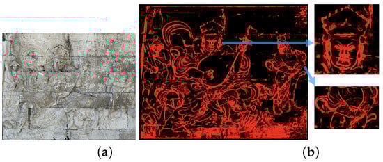 Visualization of 3D scanned point cloud data of a relief panel on the inner walls of the Cloud Platform at Juyong Pass, China: (a) Photorealistic point-based rendering with the original color. (b) Edge-highlighting visualization using the proposed method (parts of the image are enlarged for better visibility of the soft-edge regions). For the creation of (b), the change of curvature is used for f. The adopted parameters are as follows: , , , , , , , .
