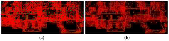 Enhancing the visibility of edge-highlighting visualization using the halo effect for the festival float, Taishi-Yama, in the Gion Festival of Kyoto City, Japan, adopting the linearity for f: (a) Conventional binary highlighting of the entire edge region, including both sharp and soft edges. (, ). (b) A visualization that incorporates both sharp and soft edges, with opacity–color gradation for the soft edges, showing the halo effect (, , , , and the default parameter values described in Section 5.3).