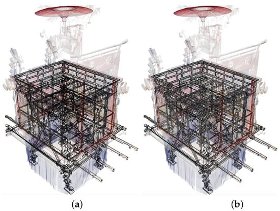 Figure 12 demonstrates the application of the proposed edge-highlighting visualization method to “see-through” visualization of a complex 3D scanned object with a 3D inner structure. The scanned object is a campus building at Kyoto Women’s University in Kyoto City, Japan. Figure 12a shows the conventional transparent visualization using SPBR, where the inner 3D structure is observable based on the transparent feature assigned to the object. However, this transparent visualization is unclear, because the inner 3D structure is complex and too many elements are included in the scene. In contrast, Figure 12b shows the result of the proposed edge-highlighting visualization method that incorporates both sharp and soft edges, extending the soft-edge regions by setting a smaller than usual. In Figure 12b, the inner structure of the building is more clearly visible compared to the transparent visualization in Figure 12a. As demonstrated by this example, our proposed edge-highlighting visualization often provides an effective “see-through” effect, enabling a comprehensible representation of the 3D inner structure of a complex scanned object.
