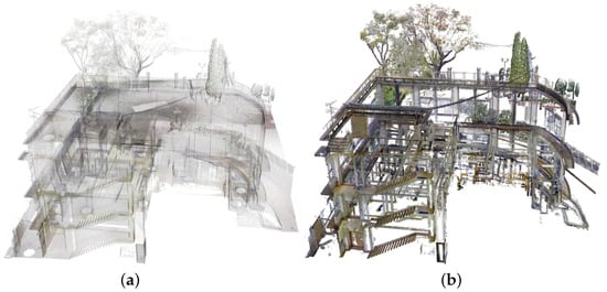 “See-through” visualizations of the 3D scanned data of a campus building at Kyoto Women’s University in Kyoto City, Japan: (a) Conventional transparent visualization using SPBR. (b) Edge-highlighting visualization using the proposed method, with the original colors chosen as the highlight color and the change of curvature used for f (, , , , and the default parameter values described in Section 5.3).