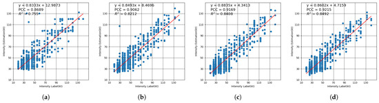 It can be seen from Figure 7a–d that the values of PCC and of the two multi-tasking methods are significantly higher those the other two methods. Among them, the classification-and-interpolation method is the worst, and its R-squared value is only 0.755, while the parallel method is the best, and its R-squared value is 0.8492. The R-squared values of the cascaded method and regression method are 0.8408 and 0.8210, respectively. Intuitively, the scatter points in Figure 7c,d are more concentrated near the fitting curve. This is mainly because the multi-task learning method introduces more supervisory information into the whole neural network, while the classification and regression methods only take one kind of supervisory information into consideration. Compared to the two multi-task learning methods, the overall performance of our parallel multi-tasking method is comparable to the performance of the cascaded multi-tasking method with the same backbone setting. On the whole, the intensity estimation results of the parallel method are better than those of the cascaded method using different backbones. When Res-2D-CNN is used, the RMSE of the parallel method is 9.50 knots, which is lower than that of the cascaded method (9.74 knots).