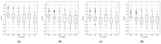 Boxplots of bias by category for the four methods: (a) Classification-and-interpolation. (b) Regression. (c) Cascaded multi-task. (d) Parallel multi-task.